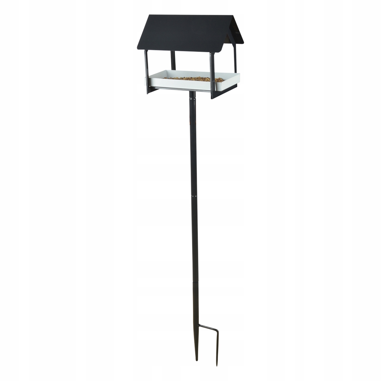Oryginalny karmnik dla ptaków wykonany z metalu w kolorze antracytowym z białą podstawką umieszczony na składanym drążku do wbijania.