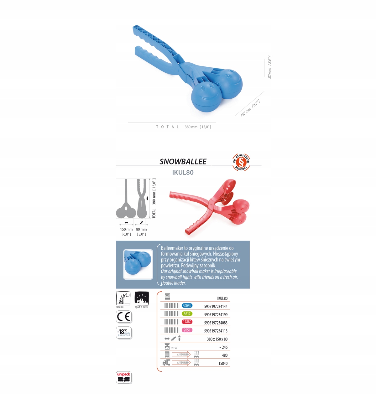 Unikniesz przemoczonych rękawiczek i zmarzniętych dłoni.Wszystkie śnieżki będą równe, okrągłe i w dodatku na każdej odciśnie się uśmiechnięta buźka.Podwójny zasobnik przyśpieszy produkcję śniegowych kul i zwiększy szansę na wygraną! Dzięki Snowballee dzieci wzmocnią swoje zdolności manualne i polubią aktywność na świeżym powietrzu. Śnieżkomat IKUL80 Snowballee to ręczna maszynka do robienia kulek śnieżnych. Śnieżkomat wytwarza dwie śnieżki jednocześnie o średnicy 8 cm. Idealny dla dzieci jak i dla dorosłych.Wymiary:8×11 cm