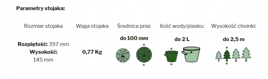 - posiada pojemnik na wodę, co pozwala zachować przez długi czas świeżość i naturalny zapach choinki.