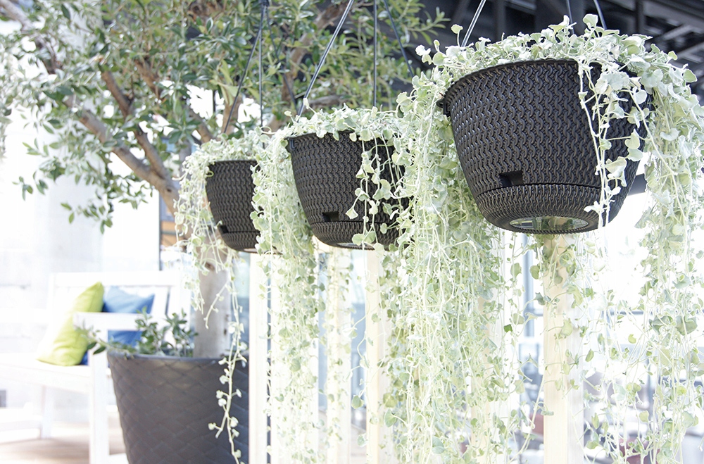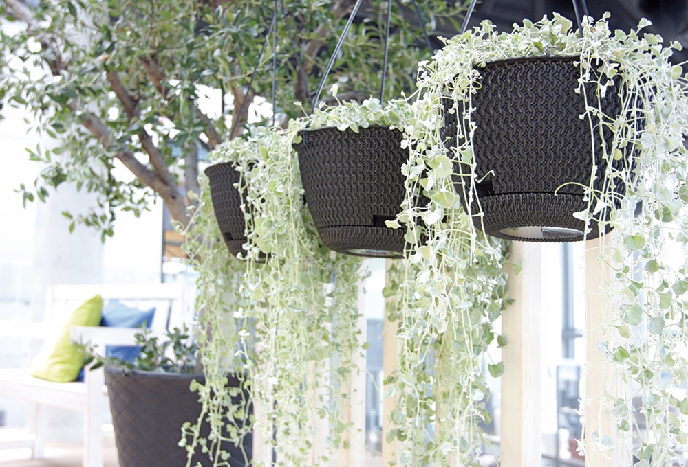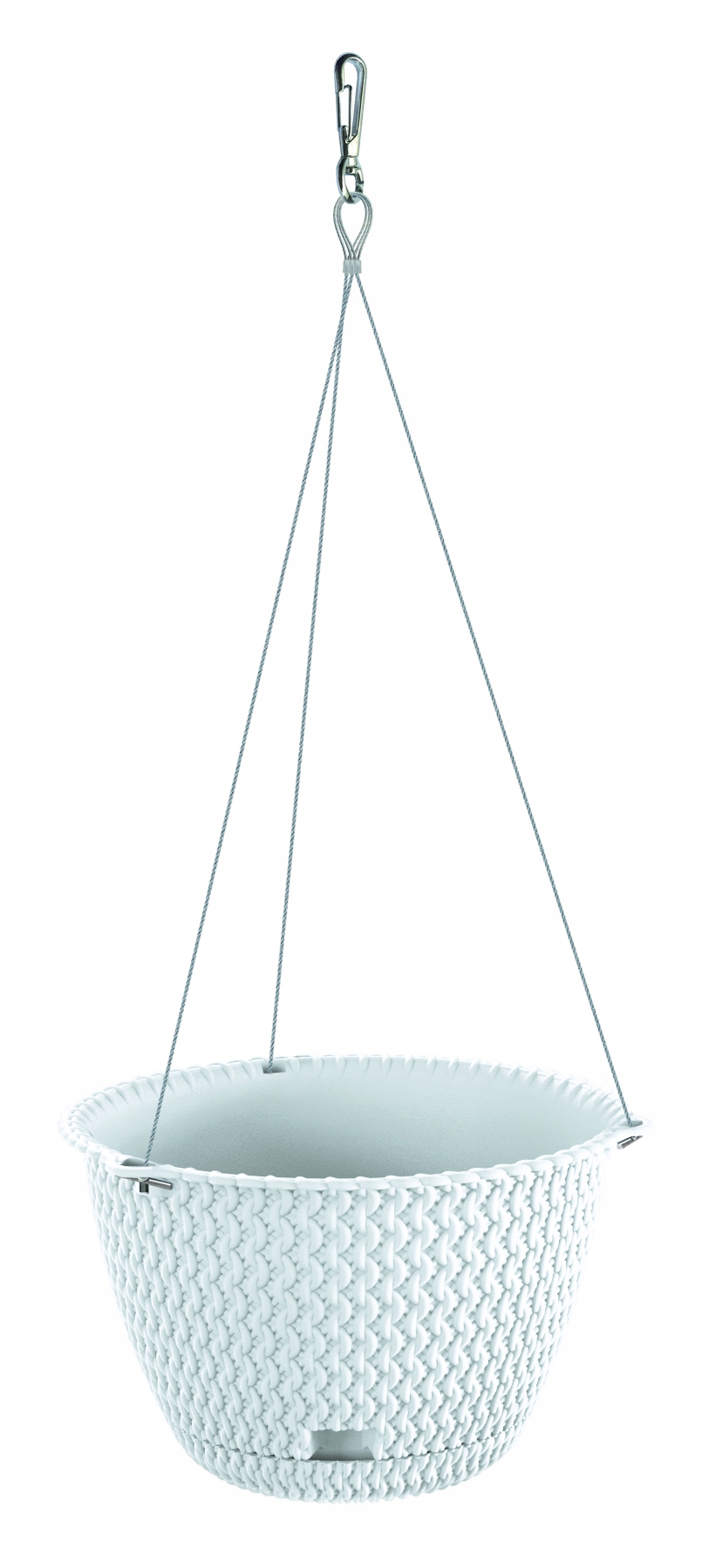 Wiszące doniczki z przestrzennym, wiernie imitującym wzór luźno plecionej miękkiej, grubej włóczki. Wyposażone w podstawkę z systemem samoblokującym z otworem ułatwiającym podlewanie.