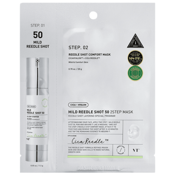 VT Cosmetics Mild Reedle Shot 50 2-Step Mask to dwustopniowa kuracja pielęgnacyjna, która łączy delikatne mikroigiełki Cica Reedle™ z kojącą maską w płacie, aby wspomóc regenerację i wygładzenie skóry. Etap pierwszy – Mild Reedle Shot 50 – pobudza skórę i poprawia wchłanianie składników aktywnych, a etap drugi – Reedle Shot Comfort Mask – intensywnie nawilża i łagodzi, przynosząc uczucie ukojenia. Formuła oparta na ekstrakcie z wąkroty azjatyckiej, aloesie, propolisie i astaksantynie wspiera odbudowę bariery ochronnej oraz nadaje cerze zdrowy, promienny wygląd.